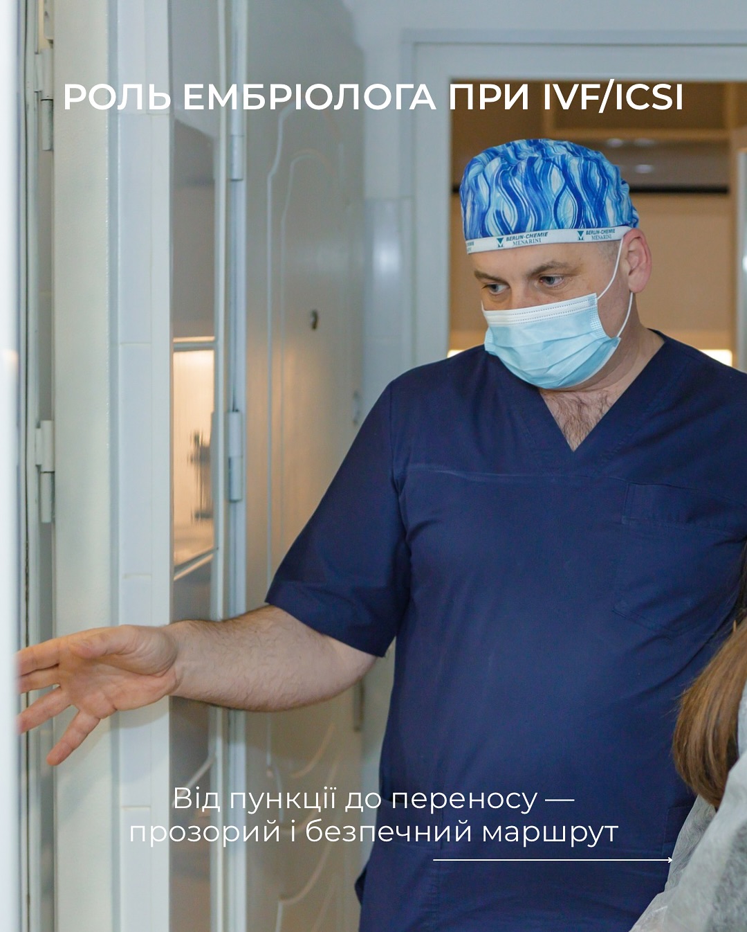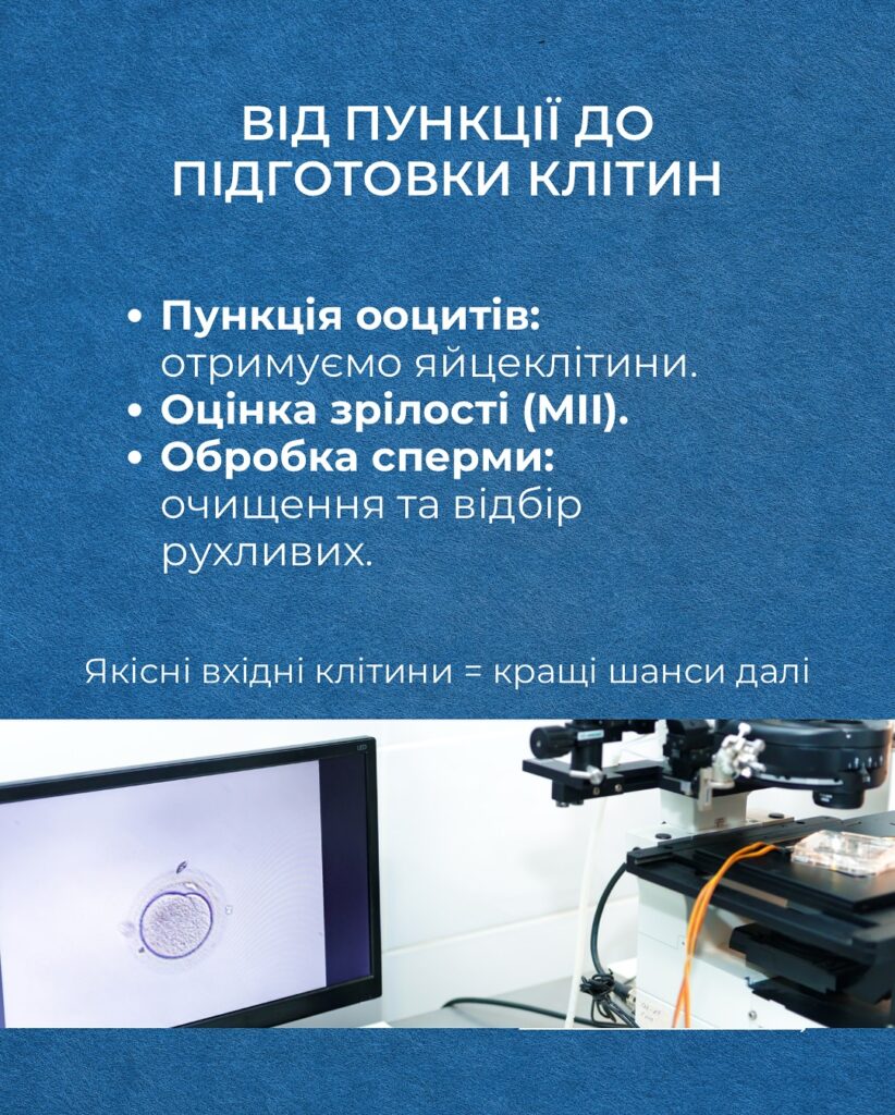 Ми відповідаємо за відбір і підготовку клітин, запліднення (IVF/ICSI), культивацію до бластоцисти, контроль якості та безпечний перенос/кріо. Метод і темп — лише за медичними показами та протоколами.
