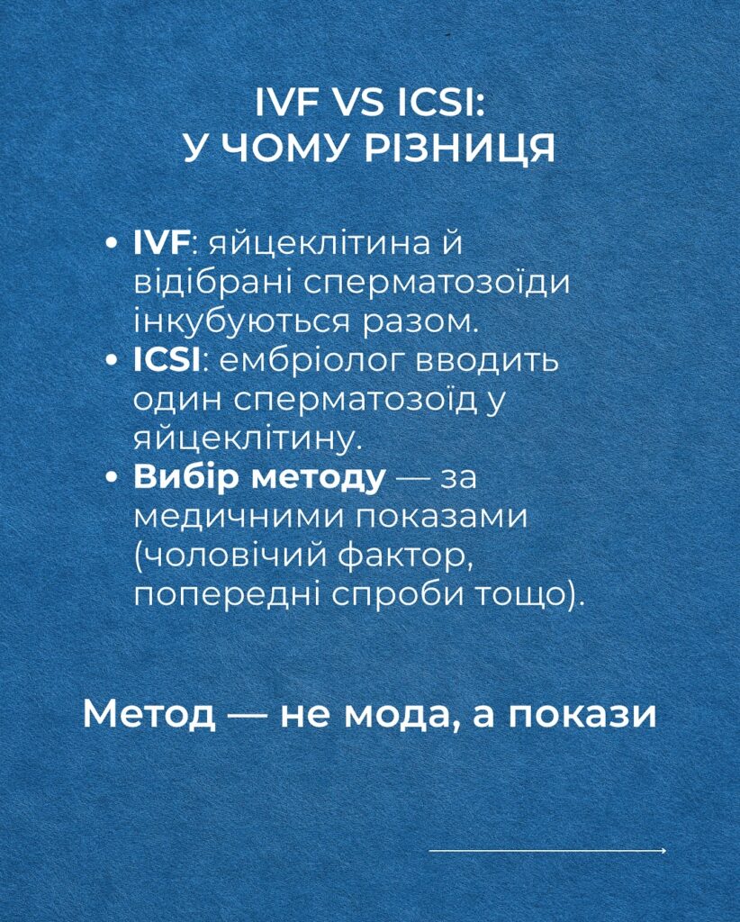 • IVF — спільна інкубація клітин; ICSI — точкове введення одного сперматозоїда.