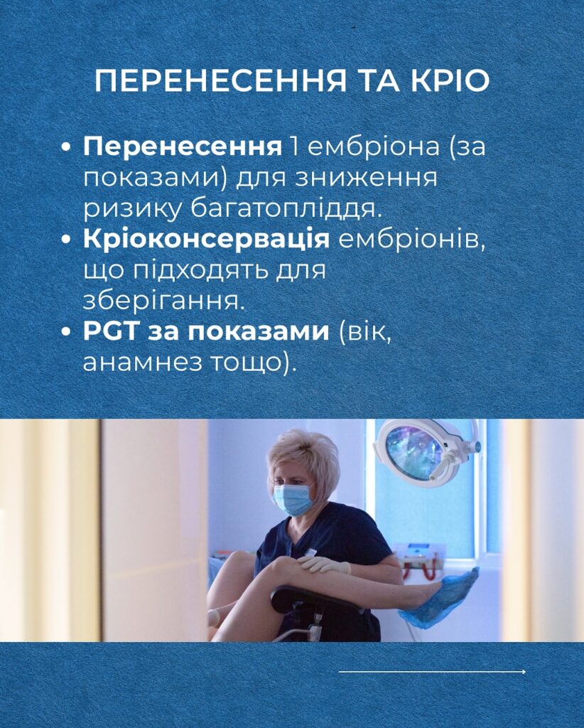 • Стратегія переносу — індивідуальна; «один ембріон» часто знижує ризики без втрати шансів.